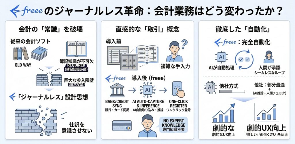 しかし、freeeはこの壁を真っ向から壊しに行きました。 それが、ジャーナルレス(仕訳を意識させない)という設計思想です。