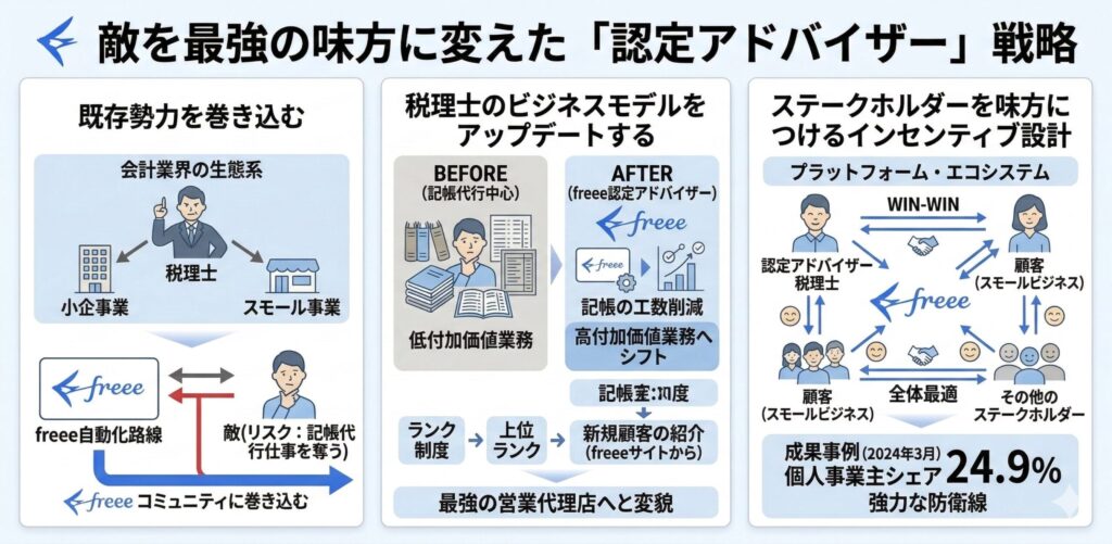 当初、freeeの自動化路線は、記帳代行という税理士の仕事を奪う「敵」と見なされるリスクがありました。