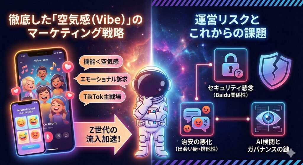 運営会社HiClubの背景にある中国Baiduとの関係性によるセキュリティ懸念や、ユーザー増加に伴う「治安の悪化」は避けられない課題です。