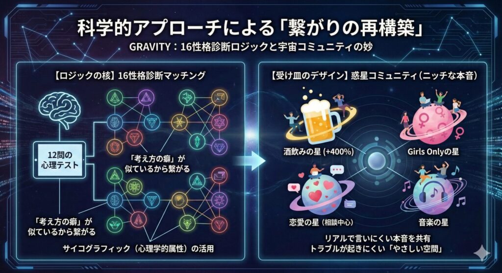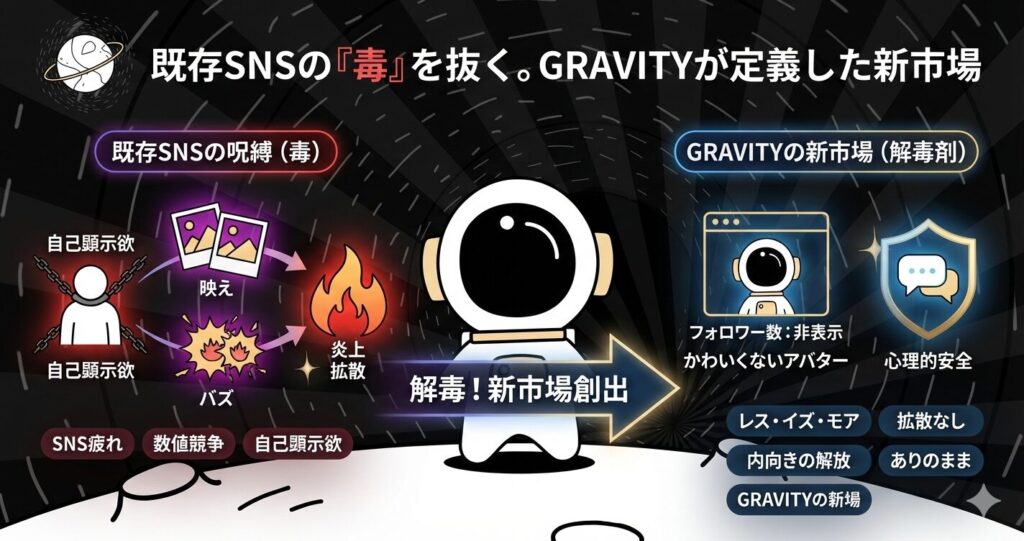 GRAVITYの成功は、メガSNSが捨て去った「匿名性」と「優しさ」を再定義し、それを科学的な性格診断で補強した点にあります。