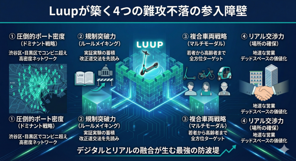 1. 圧倒的なポート密度(ドミナント戦略) 渋谷区や目黒区といった都心部では、コンビニの数よりもLUUPのポート数が多いという逆転現象が起きています。この「歩けばすぐにある」という密度こそが、ユーザーに「いつでも乗れる」という安心感を与え、習慣化を促進しています。