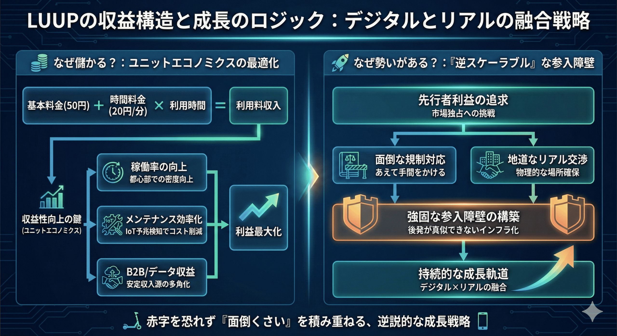 Luupが証明したのは、「リアルな交渉」「物理的なメンテナンス」「規制対応」といった、誰もがやりたがらない「面倒くさいこと」の積み重ねこそが、最も強固な利益の源泉になるということです。