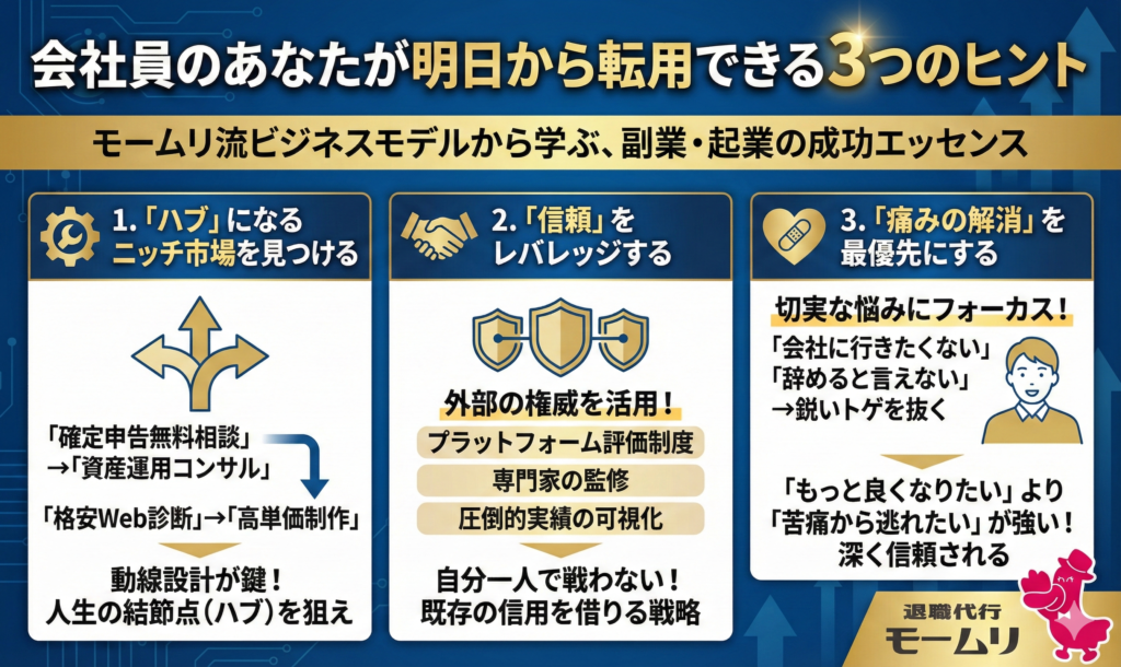 モームリの成功事例を「すごい会社の話」で終わらせては意味がありません。あなたが副業や独立を考える際に、今すぐ使えるエッセンスを抽出します。