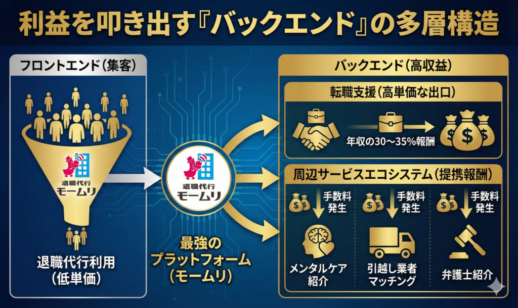 - 退職代行は「呼び水」。高単価な転職紹介や提携料で利益を最大化。