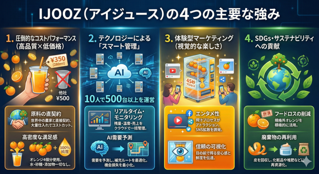 ここからは、従来の自販機ビジネスの限界を突破し、競合他社を寄せ付けない圧倒的な強みを4つの視点から深掘りしていきます。